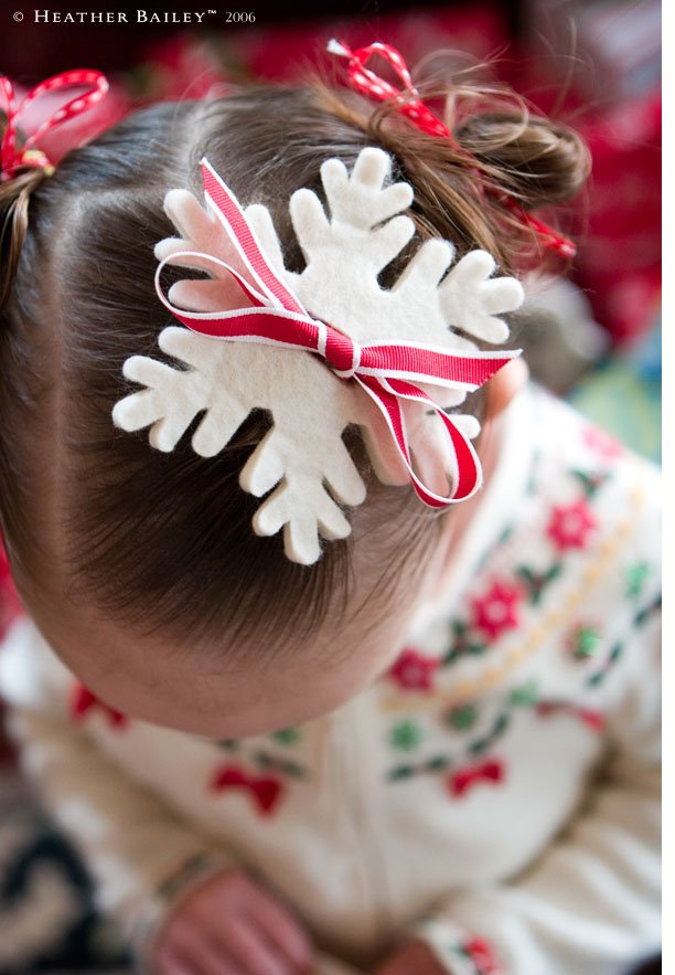 Here’s a fun use for those great Anthropologie giftwrap-snowflake -thingies. I’m not into hair bows, but this bit of sass works for me somehow. The snowflake has a slit in it, so I just tied a ribbon around Charlotte’s little ponytail, threaded the ends through the slit and tied a bow. The ribbon holds the snowflake in place — no barrette or clip. In fact, it was such a piece of cake, I’m going to cut out a few felt flowers to keep on hand for this same purpose.