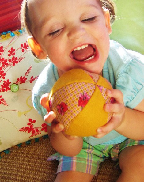 I stuffed each ball lightly, then added in a little beanbag filled with poly-pellets. Then I added more Polyfil until the ball was rather firm (so the beanbag ends up in the center of the ball, with padding all around it). The beanbag gives them the perfect weight for tossing and somehow, magically, they actually bounce a bit!