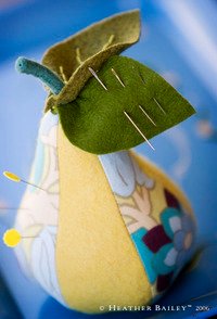 Well, the van’s all packed and we’re heading out the door on our long drive to Utah for a Tuesday wedding. I’ll leave you with this detail shot of a pear pincushion. I meant to include this in an earlier post and get your take on it. You see, the first time I made one, it only had one leaf. This time I added a second leaf. Together, the two leaves make a sort-of needlebook — poke the needles through the underleaf and hide them with the upper leaf. I’m still trying to decide which is better — any thoughts?