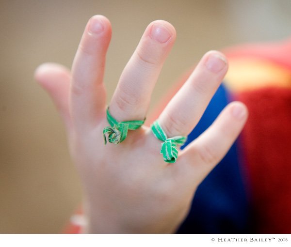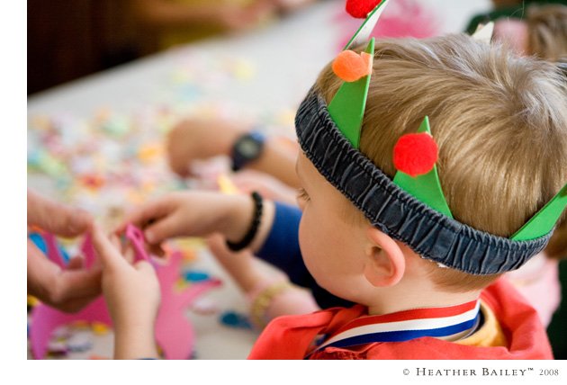 Charlotte’s party was a royal gala. All the lords and ladies of the kingdom were in attendance, wearing their finest threads. Little Max here, aka Lord Max of Hall, topped the parade with his bejeweled crown and emerald twist-tie rings. Have a pair of thread-bare toddler trousers flitting around somewhere? Why, cut the waistband off and make a crown of course! And rings, a king must have his rings.Â